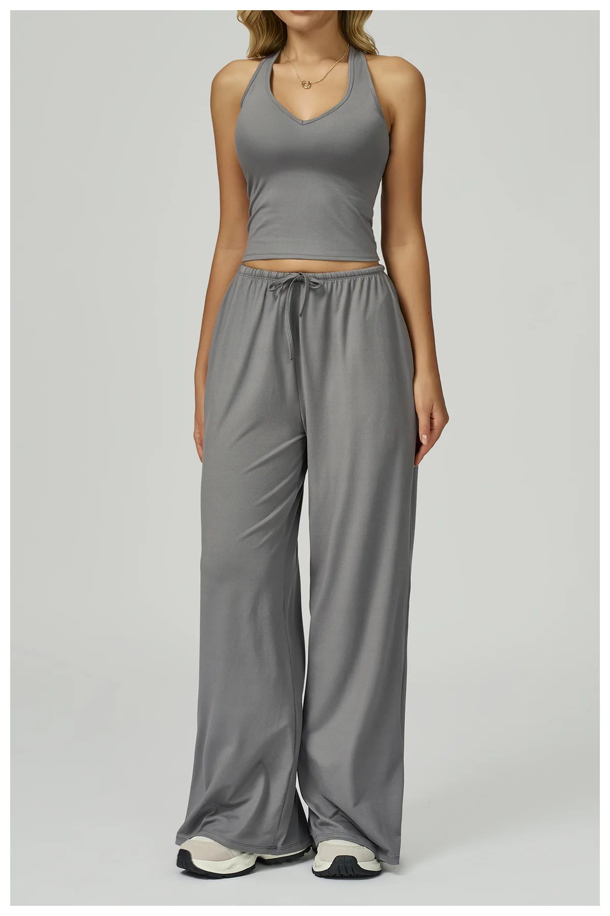 Le top dos-nu ajusté sublime la silhouette tandis que le pantalon large à taille élastique assure une liberté totale de mouvement.