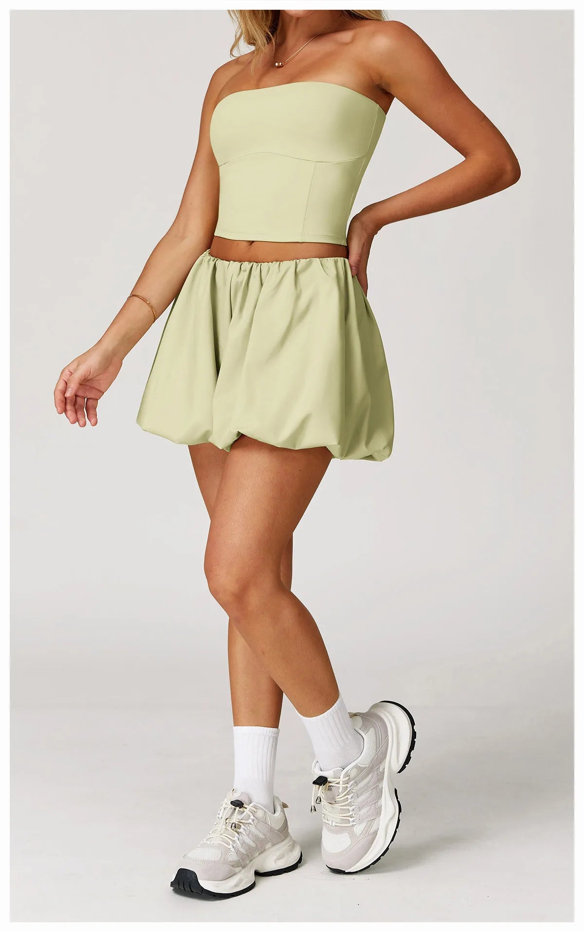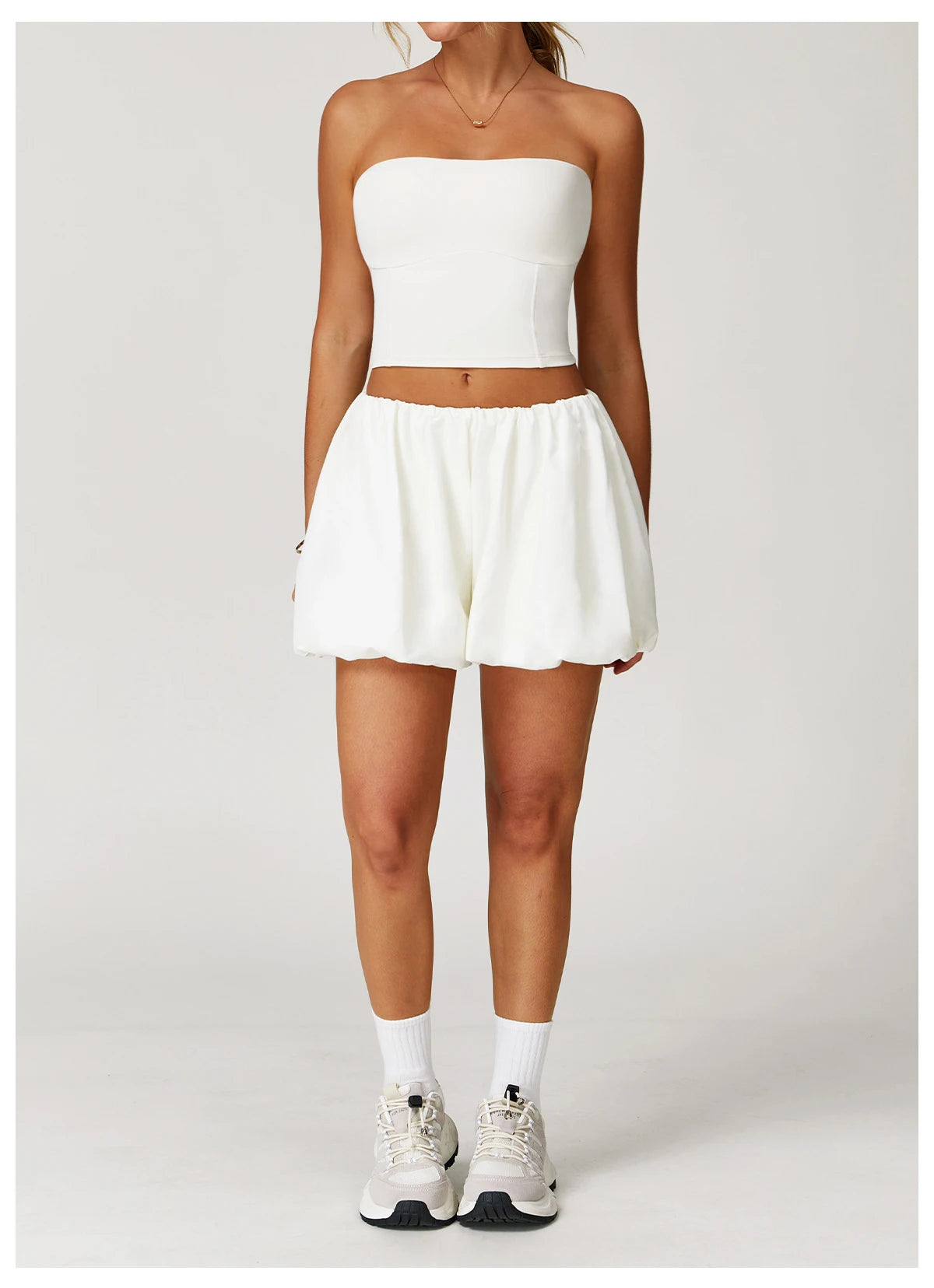 Cet ensemble associe un top bandeau structuré à un short effet ballon fluide, pour un look à la fois minimaliste et affirmé.