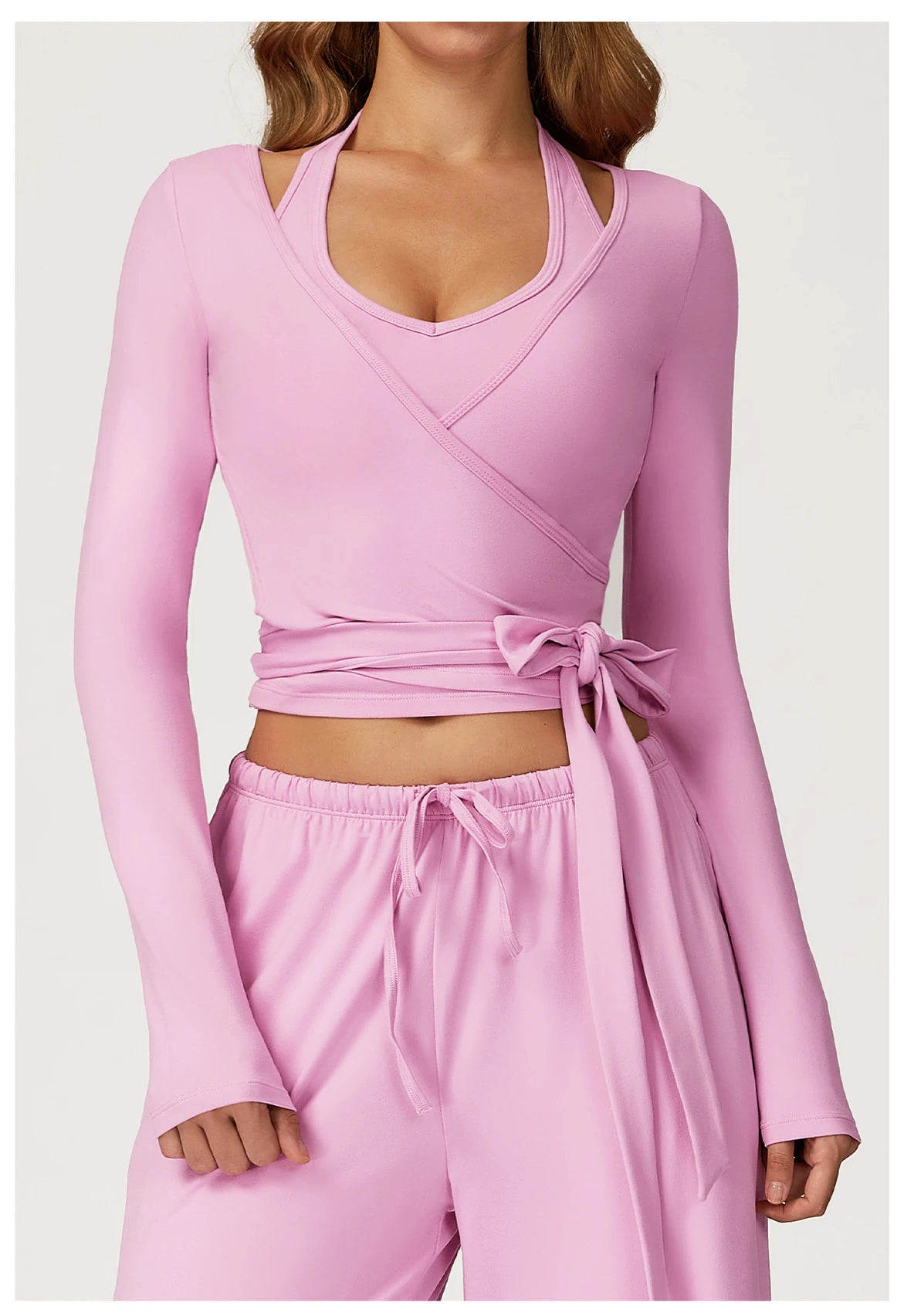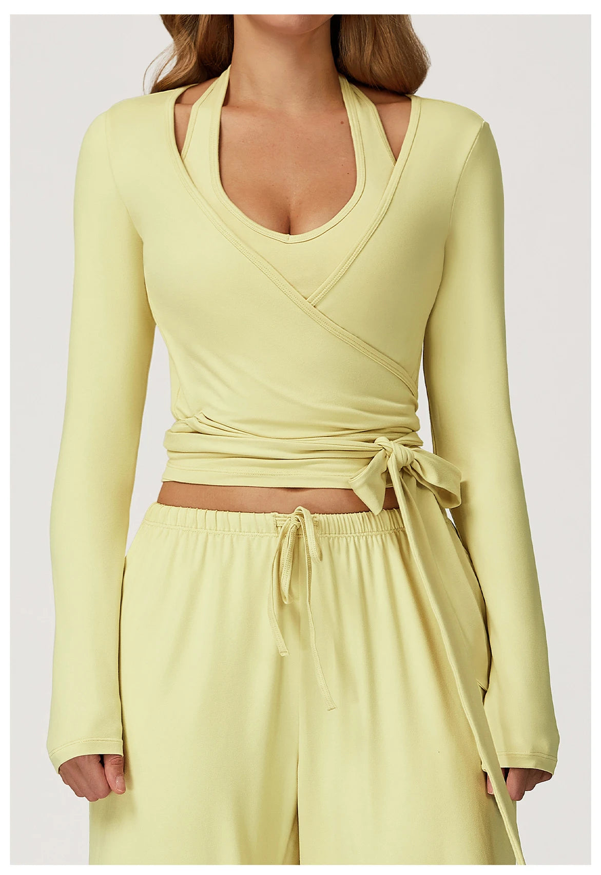 Composé d’un top dos-nu, d’un cache-cœur à manches longues et d’un pantalon fluide à taille élastique, il allie légèreté, confort et allure raffinée.
