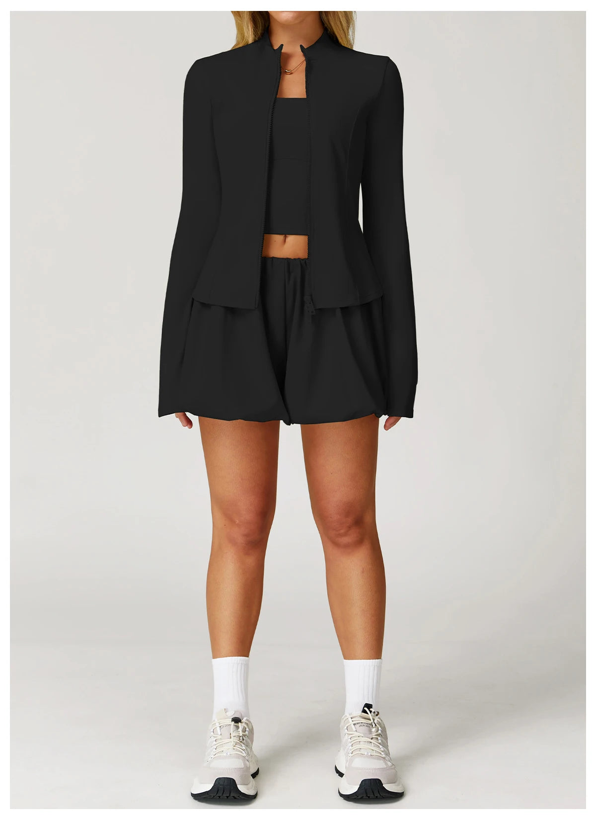 Cet ensemble trois pièces associe style minimaliste et confort absolu. Le top sans manches met subtilement la silhouette en valeur, le short fluide à taille élastique assure une aisance parfaite, tandis que la veste légère zippée apporte une touche moderne et structurée à l’ensemble.