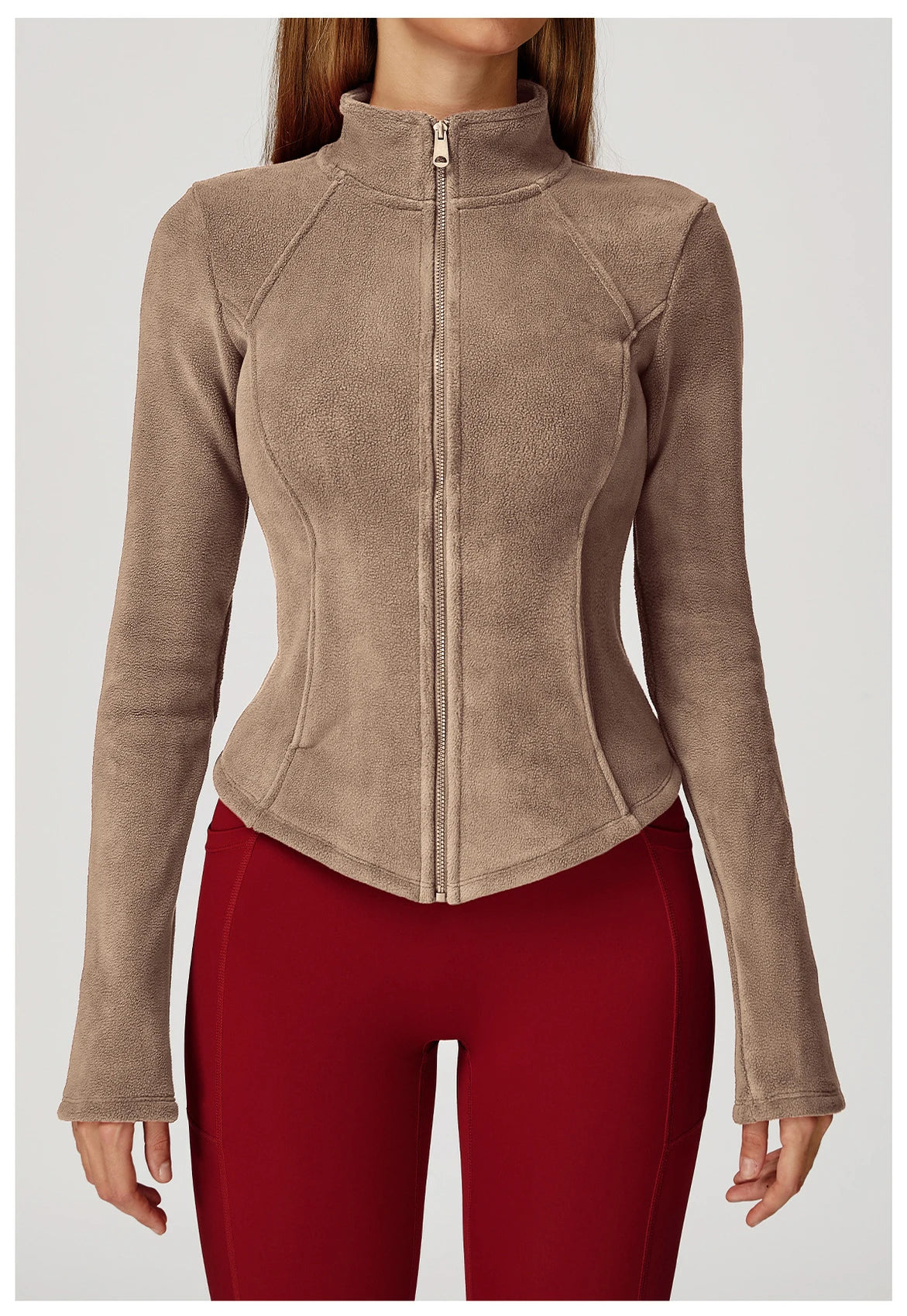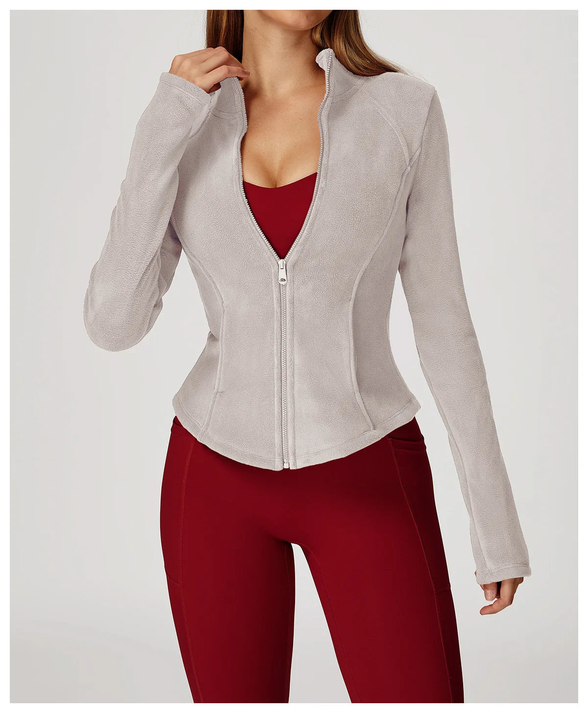 Sa coupe cintrée met en valeur la taille tandis que le col montant zippé offre une allure sportive et élégante.